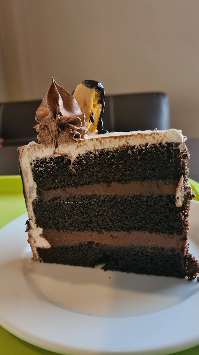 Torta de chocolate con dos capas de relleno de chocolate, envinado tres leches y cobertura de chantilly de chocolate.